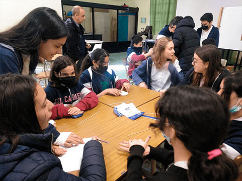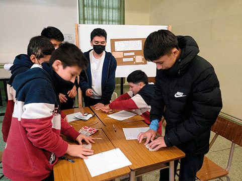 Alumnos 7mo B realizando una actividad con los alumnos de Primer Año, enmarcada en el Proyecto de Articulación Nivel Primario Nivel Secundario.